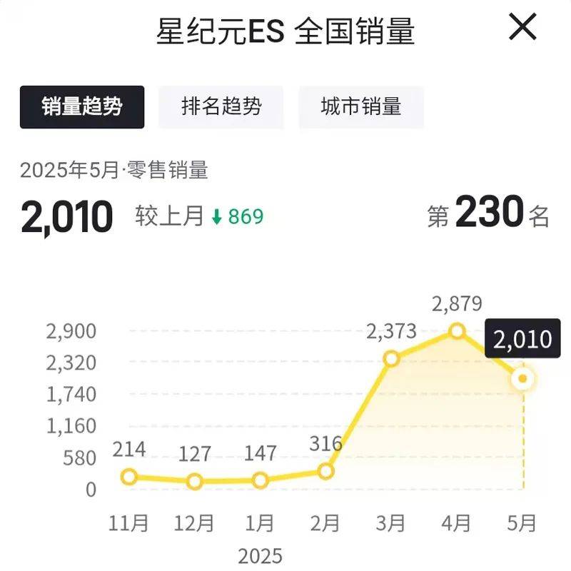比如今年5月份,星紀元ES的銷量為2010輛,相比今年4月份的銷量2879輛,環比下滑30.18%。