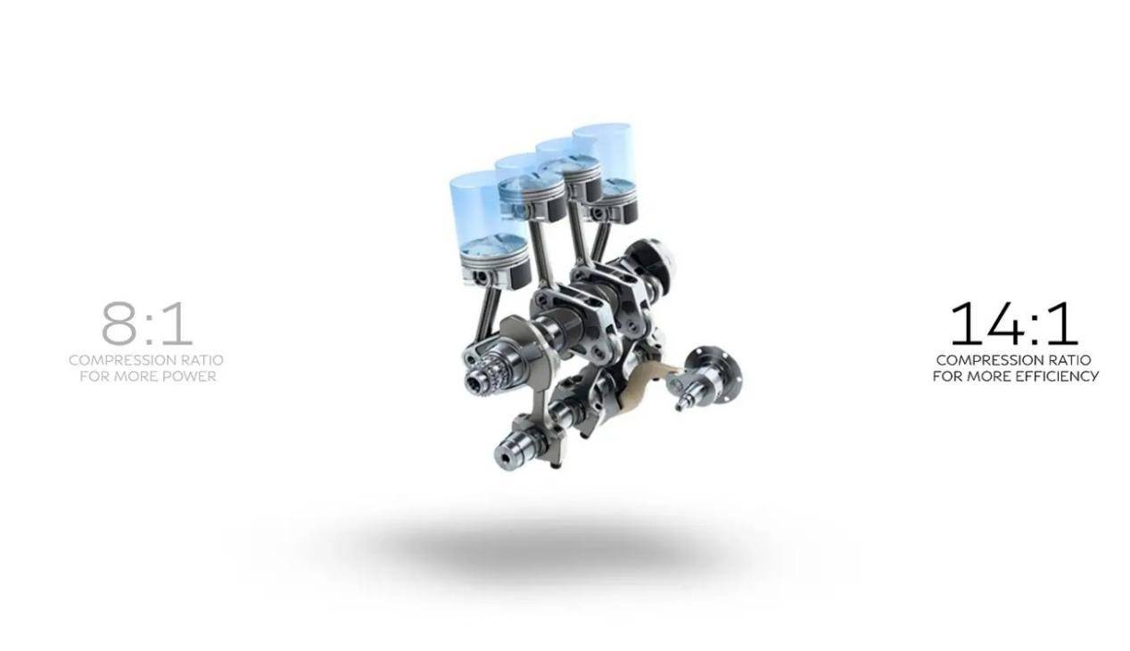 日產的VC-Turbo發動機想要魚與熊掌兼得。采用了一種復雜的多連桿機構,可以動態改變活塞在汽缸中的運動軌跡,從而實現從8:1到14:1之間的壓縮比調整。在高速加速時,系統自動降低壓縮比獲得更強動力;而在巡航或怠速狀態下,則提高壓縮比以節省油耗。聽起來是不是像“發動機界的變速箱”?