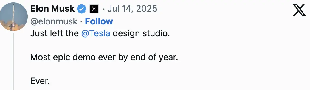 所謂“更大的”,馬斯克在X上預(yù)告了即將有一個(gè)“史詩(shī)級(jí)大Demo”。