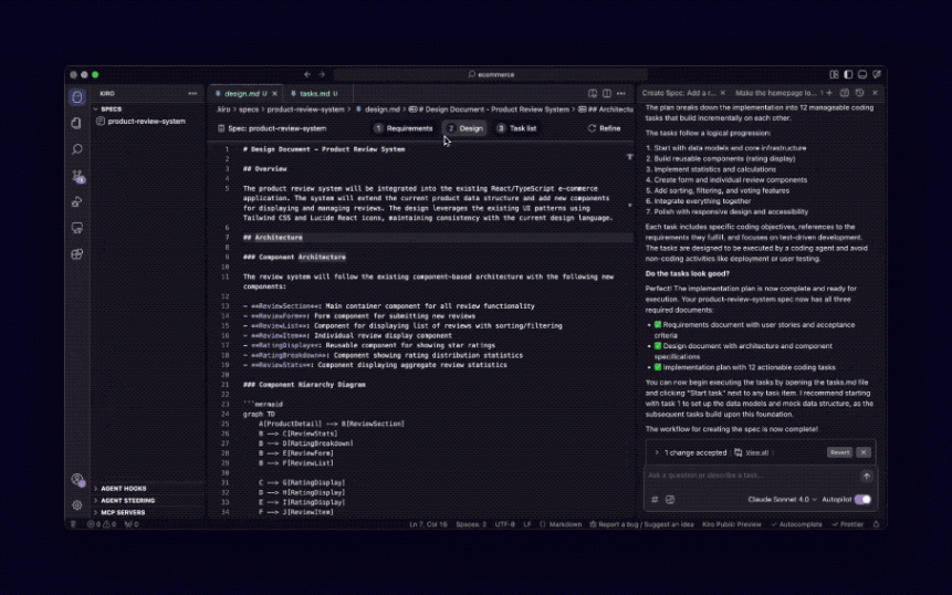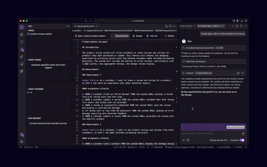 以及面向開(kāi)發(fā)者,諸如Kiro這樣的AI編程應(yīng)用,更是重新規(guī)范了AI Agent在編程任務(wù)中的流程,目標(biāo)依舊是能夠保障“生產(chǎn)級(jí)”。