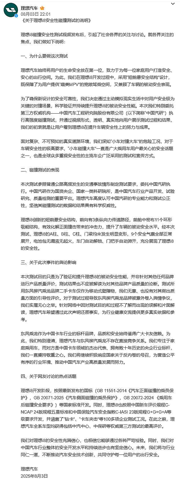 《關于理想i8安全性碰撞測試的說明》終于來了,這是一份來自理想汽車品牌方的正式說明,而非來自某些高管的個人意見;當品牌方表明態(tài)度之后,爭議事件相信就快能結束了。不過前提還是其說明能夠讓乘龍卡車方面認可,那么就先來看說明的內(nèi)容吧。