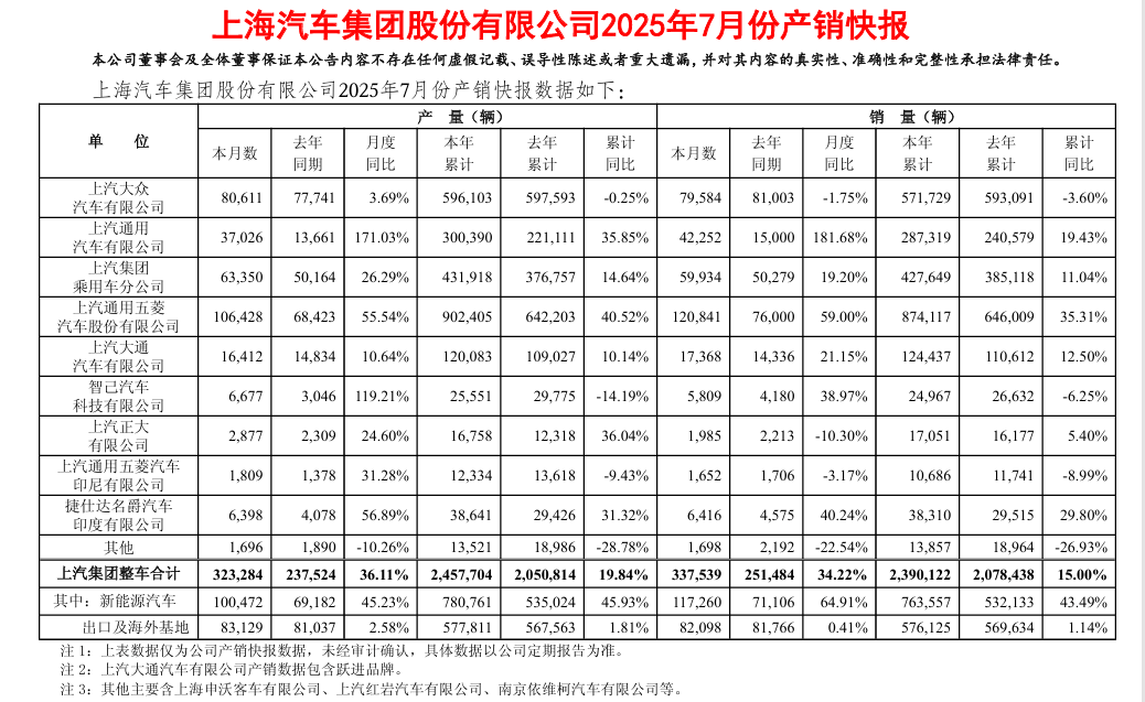 從上汽集團發(fā)布的最新產(chǎn)銷快報來看,集團7月銷量達33.8萬輛,同比增長34.2%,實現(xiàn)了月銷“七連漲”,1-7月累計銷量達239萬輛,同比增長15%。