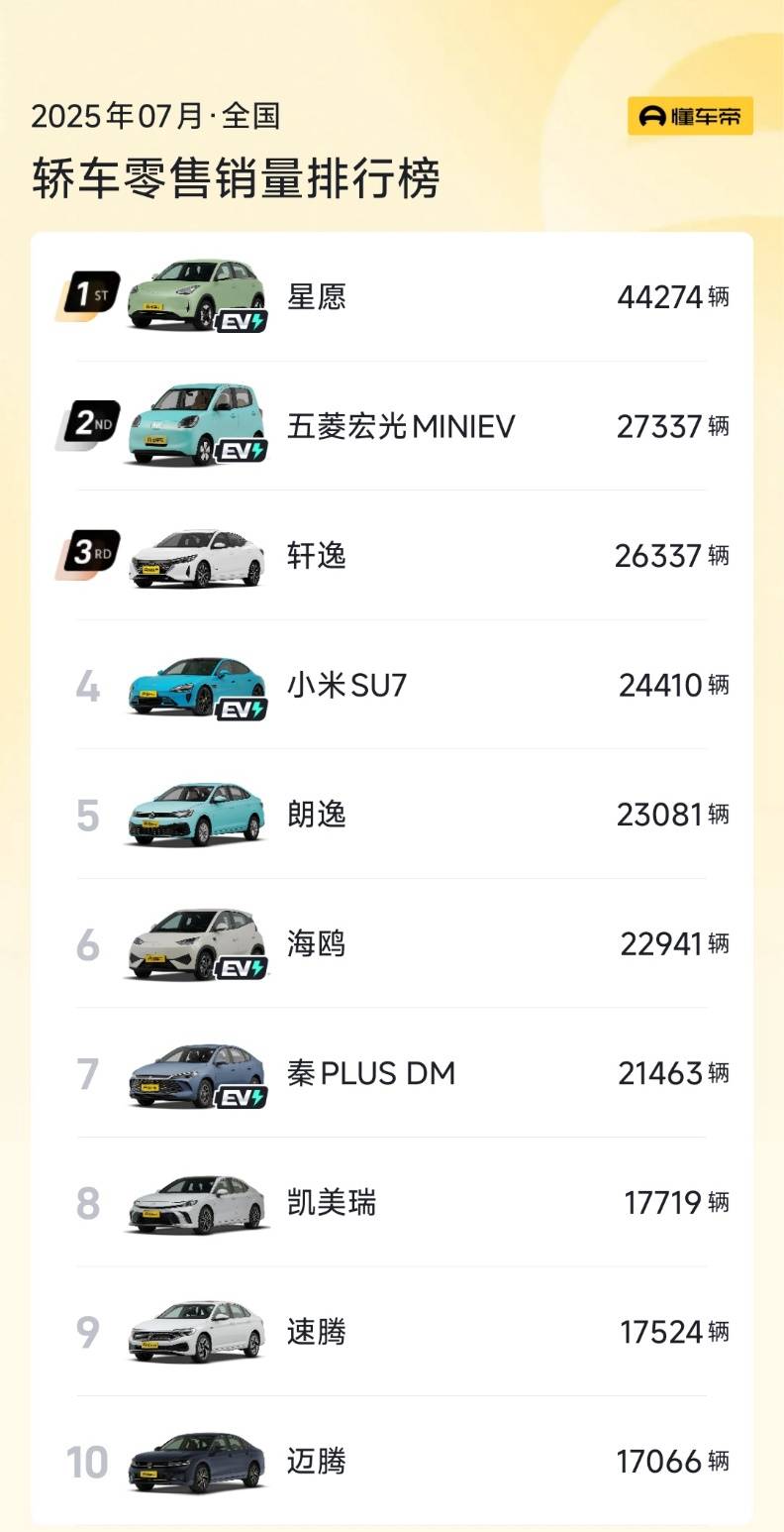 轎車TOP10呈現新能源與燃油車平分秋色的局面,但新能源車在排名上更靠前。吉利銀河星愿、宏光MINIEV分列前兩名,小米SU7、海鷗、秦PLUS DM的月銷量都超過了2萬輛。