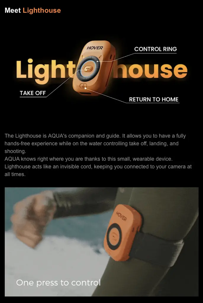 官方重點介紹了這款無人機隨附的 LightHouse 腕帶外設,用戶在佩戴腕帶后,即可按下腕帶的按鈕讓無人機對自己進行跟拍、同時可一鍵召喚無人機 / 一鍵令無人機降落。