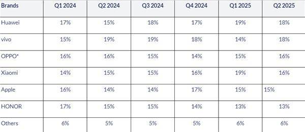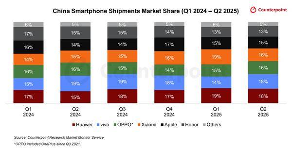2025Q2中國手機出貨量排名:華為、vivo前二!小米第四