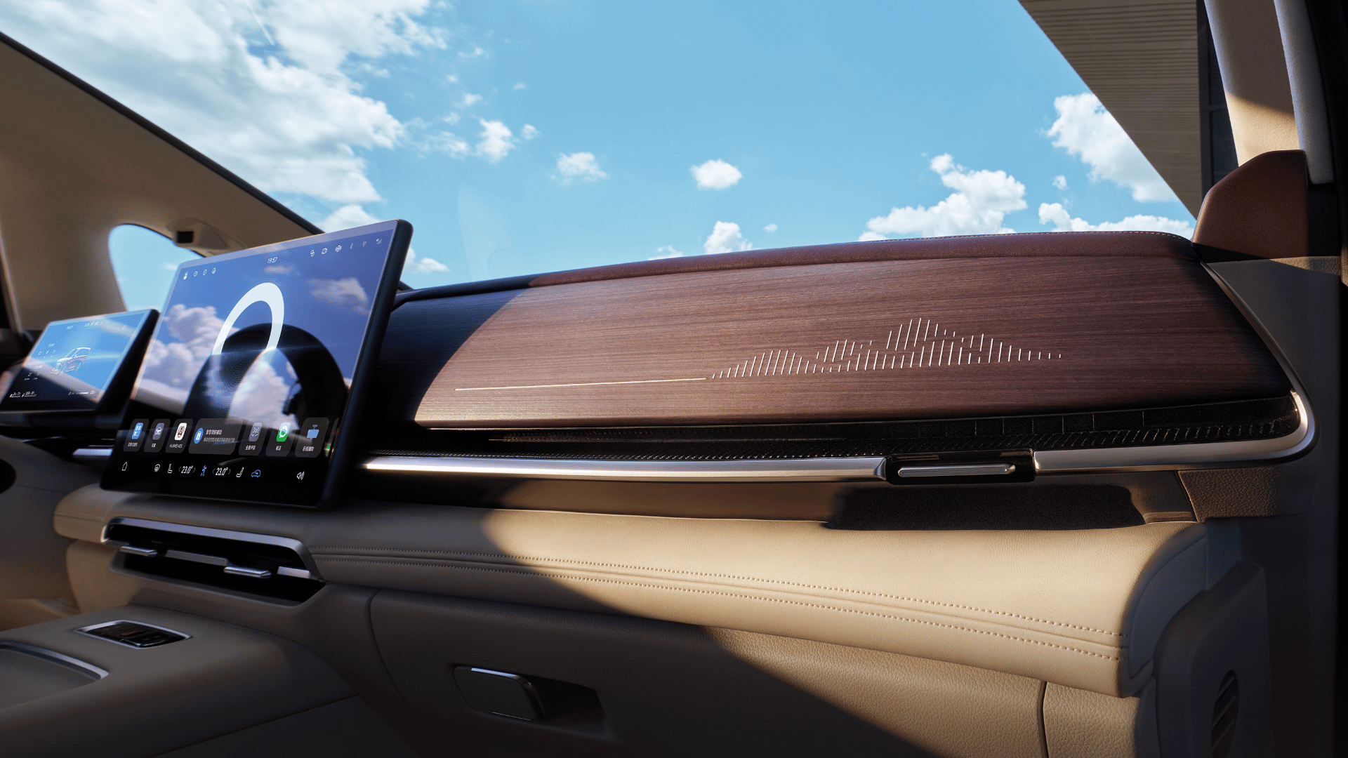 坐進車內,2026 款嵐圖夢想家的內飾設計令人眼前一亮。紫米與玄青兩種雙拼配色內飾,營造出濃郁的東方美學意境。中控臺配備的斑馬木紋飾板,紋理細膩,質感十足,與車內的軟包材質相得益彰,為乘客帶來溫馨而豪華的觸感體驗。車內常觸摸區域均采用軟質材料包覆,從細節處彰顯對乘客的關懷。