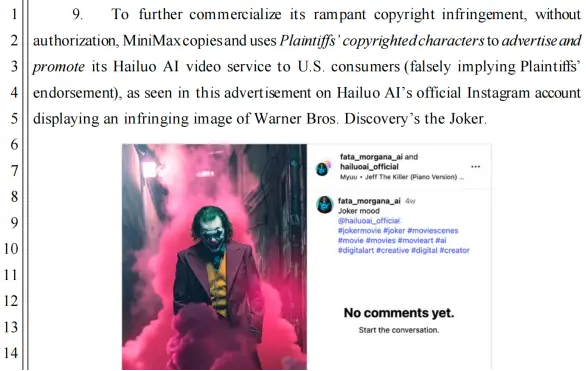 其舉例稱,“Hailuo AI官方Instagram賬號”曾“展示一張侵犯版權的華納兄弟探索公司(Warner Bros. Discovery)旗下小丑(Joker)角色的圖像。”