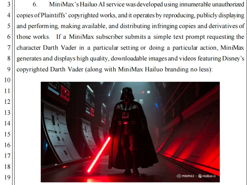 比如,起訴書中稱:“如果MiniMax訂閱用戶提交一個簡單的文本提示,請求角色達斯·維達在特定場景中或執行特定動作,MiniMax就會生成并顯示高質量的可下載圖片和視頻,其中包含迪士尼受版權保護的達斯·維達(以及MiniMax Hailuo品牌)。”